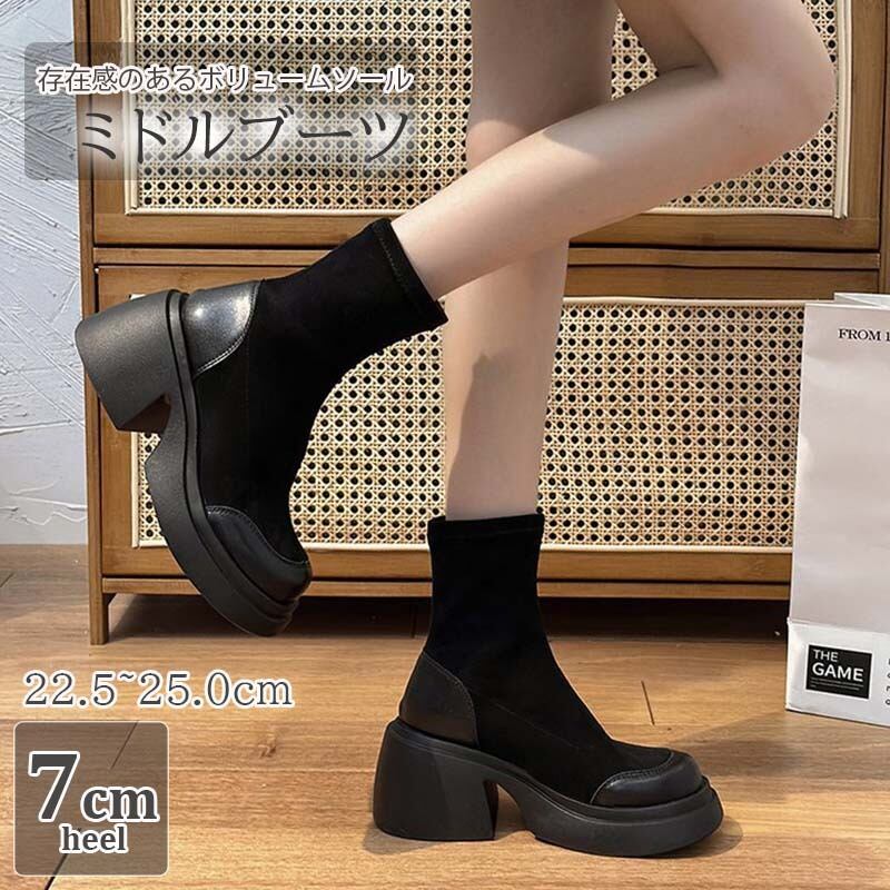 ショートブーツ 太ヒール スエード調 厚底 チャンキーヒール