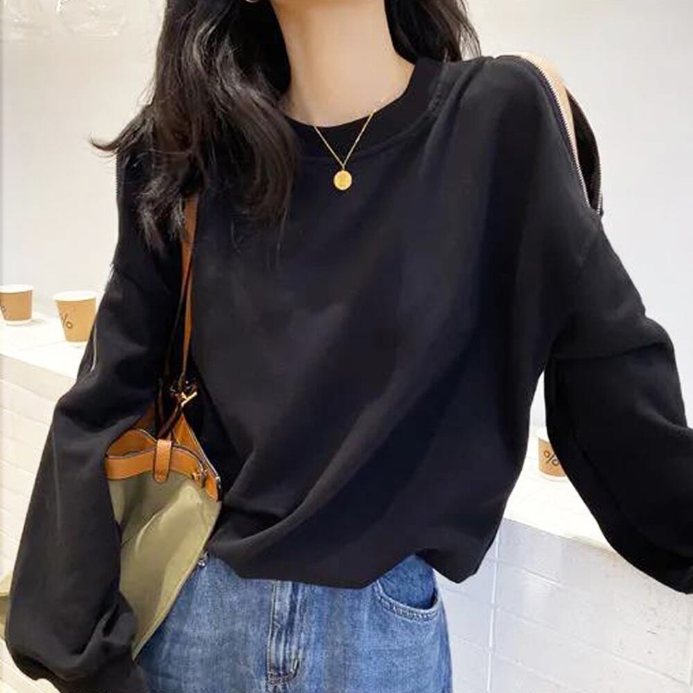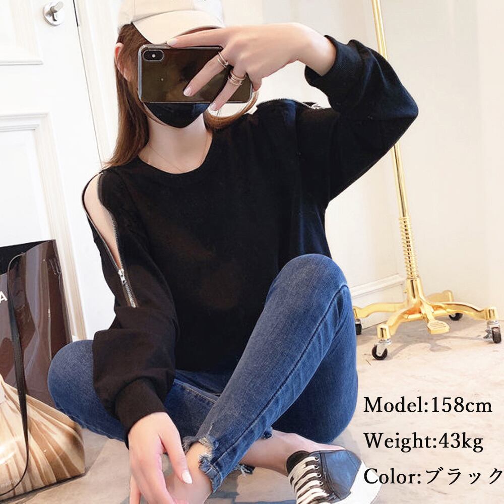 スウェット クルーネック 肩出しトップス ゆったり セクシー ファスナー カジュアル 体型カバー