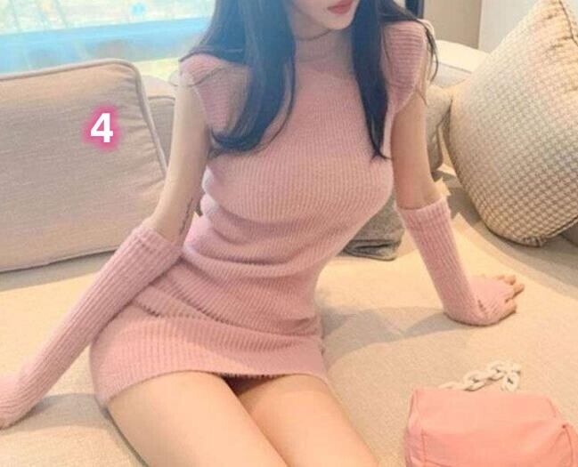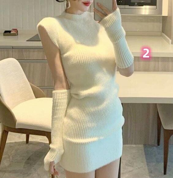 手袋付き 半袖 ニット ミニ ワンピース ドレス タイト 2点セット