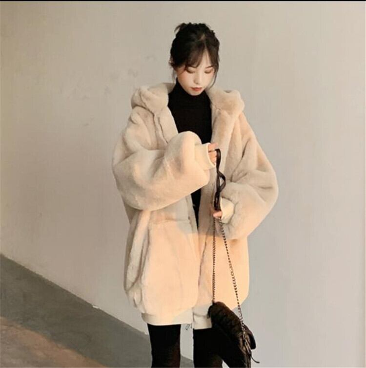 セクションジッパー 模造ウサギ毛皮フード付きコート